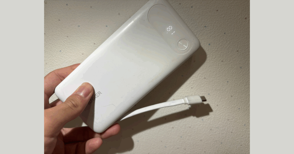 他のモバイルバッテリーと大きく違うのが、USB-Cケーブルが本体に内蔵されていることです。